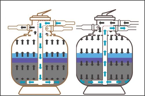 4.随着正常过滤的时间增加,滤饼会逐渐增厚,过滤阻力逐步增加。直观的表现就是过滤器的压力表读数增加,当压力增加到正常压力的30%时,(如正常的压力为1.0kg/cm⊃2;,当压力达到1.3kg/cm⊃2;),就需要进行清洗过滤器。把缸头控制器上的手柄推向倒冲洗,水流便由过滤主管进入,经缸底的过滤管排出,水流从底部向上升,把砂层内的污物排出,之后把控制器推向清洗管内之污物从砂缸排出。时间大约为半分钟到1分钟后,把手柄推向回复正常过滤。(注意:转换阀门或者缸头控制位置时,要先关掉水泵电源)