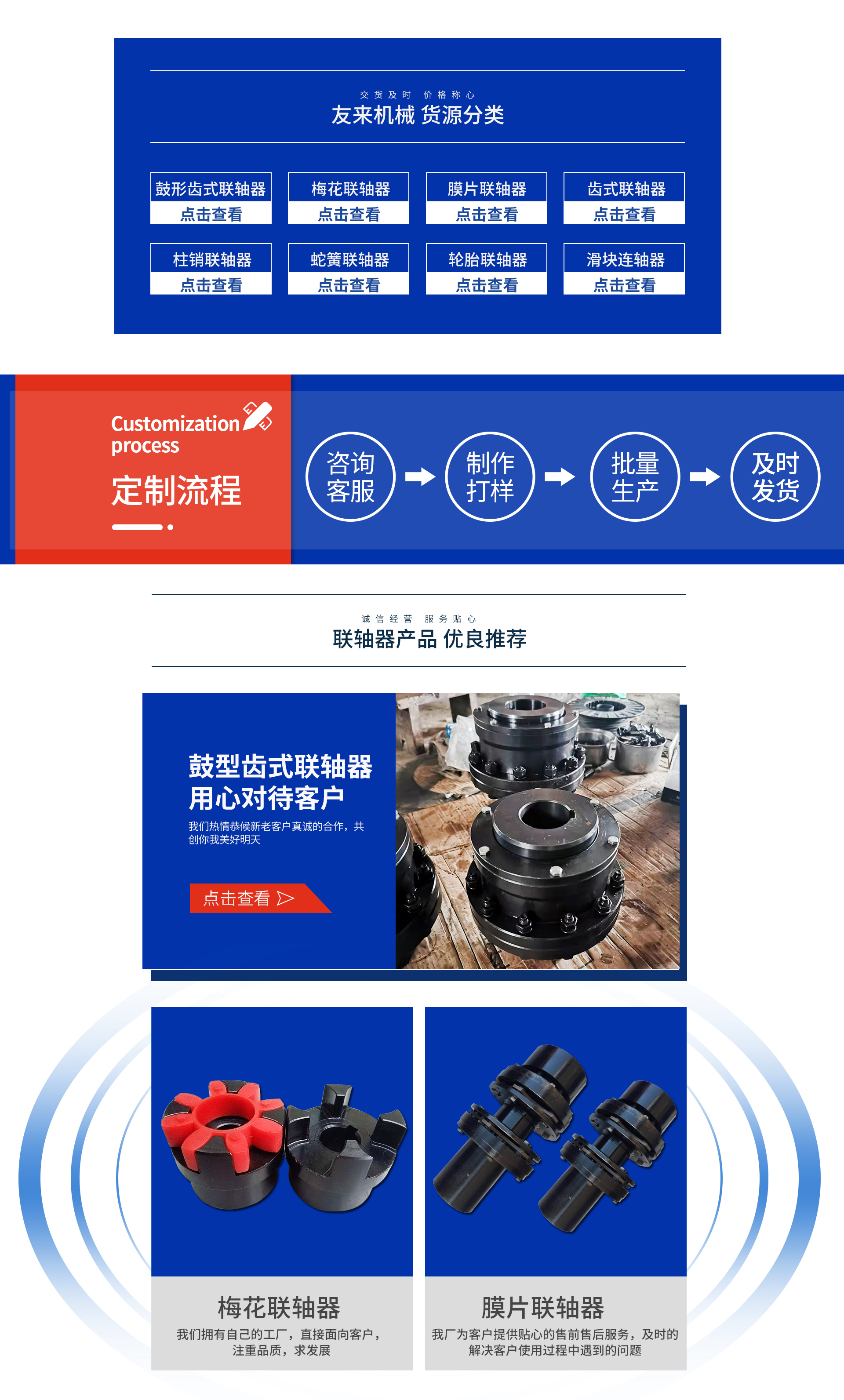 Bo tou You Lai Machinery Equipment Co., Ltd., originally known as Bo tou City Canal Machinery Factory, is a manufacturer specializing in the research, production, and sales of couplings and transmission components. Established in 2000, our main products include various types of gear couplings,梅花 couplings, diaphragm couplings, elastic couplings, and a variety of other coupling and accessory products. Our factory has extensive experience in couplings and can handle customized non-standard couplings to meet various customer needs. For more details, please call: 13931743721 or 15128730447.We've earned the trust of numerous clients with our sincerity, and we will continue to reward both new and old customers with our high-quality products and热情服务. We hope you'll be our next client!Our operating philosophy is: Integrity, Pragmatism, Innovation.