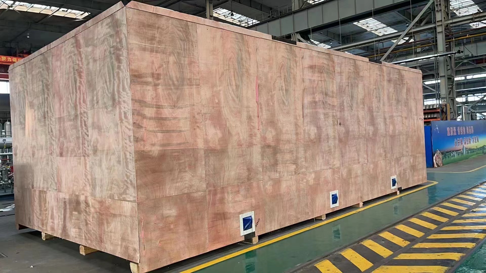 2021年12月17日,沈阳正安包装有限公司完成了沈阳鼓风集团一箱超大件的包装。该件包装后箱体尺寸长9700mm,宽4700mm,高3600mm,毛重27000kg。箱体体积之大是沈阳正安包装有限公司包装历史。此箱重点在于箱体太宽,起吊时箱体侧扇上框木以及箱体的横梁受力很大,如何考虑顶盖结构以及各构件截面尺寸的大小是该箱安全的关键。因为框架木箱国家标准中列出的相关数据也仅仅列到箱宽3500mm,因此更需要专业设计师去设计。正安包装设计师设计时将在吊绳通过的区域增加了加强材,增强了上框木和横梁的抗力强度,保证了箱体起吊的安全。