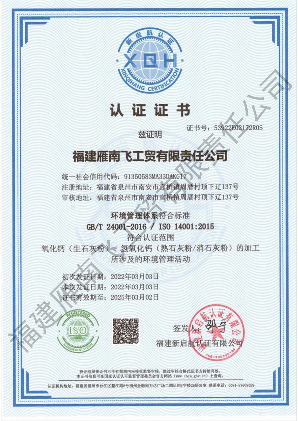| 发证机构: | 福建新启航认证有限公司 | 发证时间 : | 2022-03-03 |