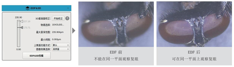 Open the "Capture-Imaging-EDF&3D" module of the software, use the mouse to confirm the in-focus and out-of-focus planes you want to observe in the image, click "EDF," and it will automatically expand the depth of field, achieving a full-frame focus image, allowing you to view all feature points on the same plane.