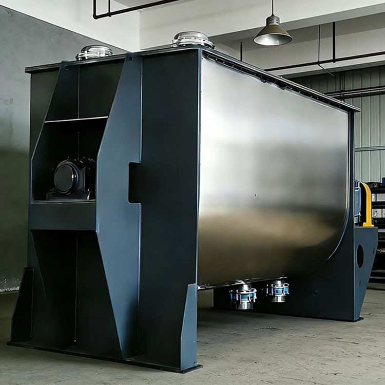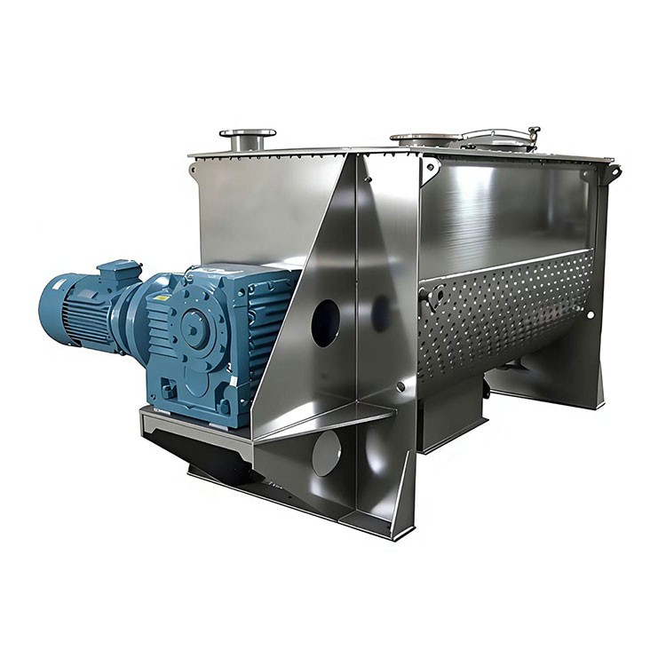 The horizontal screw blade mixer consists of an U-shaped container, screw blade agitator blades, and transmission components; the screw-shaped blades are typically made in double or triple layers. The outer spiral gathers materials from both sides towards the center, while the inner spiral transports materials from the center to the sides, creating a convectional mixing effect. The screw blade mixer is effective for blending sticky or cohesive powder particles, as well as mixing liquids and paste-like materials with powders. The cylinder cover can be designed as a full-open door for easy cleaning and product changeovers.